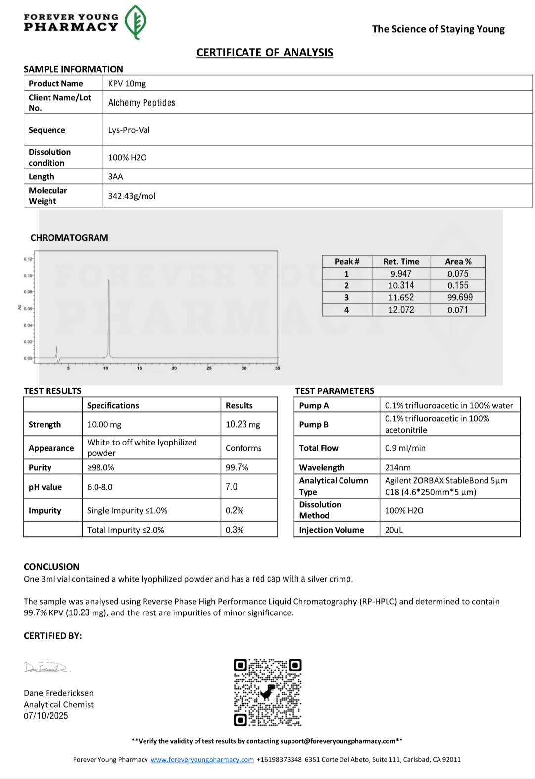 KPV (Ac-KPV-NH2) is a short synthetic peptide fragment derived from alpha-MSH, composed of lysine, proline, and valine. Research examines its anti-inflammatory properties across multiple biological systems, including the gastrointestinal tract and vascular pathways. KPV remains under scientific study and is provided strictly for laboratory research purposes only.